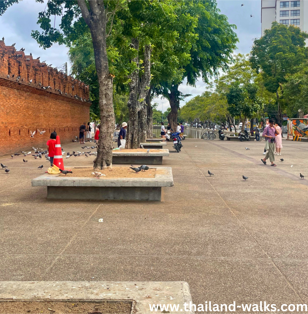 If there was ever a surprising sight at Tha Phae Gate that I was not expecting, it was the groups of tourists, surrounded by exploding grey feathers, capturing an Instagram moment. So much so, that there are people devoted to luring pigeons with bird seed, waiting for them to gather around the inspiring influencer, and just as the perfect moment approaches, scaring them off with a wooden broom, resulting in an explosion of feathers.