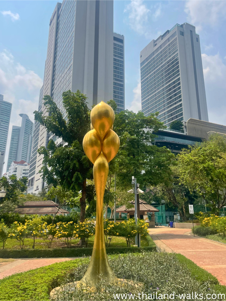 Much of the art that you will see in Benchasiri Park was donated by local Thai artists. The centerpiece of this outdoor art exhibit is the golden pyramid surrounded by yellow flowers found near the back of the lake overlooking the skyline.