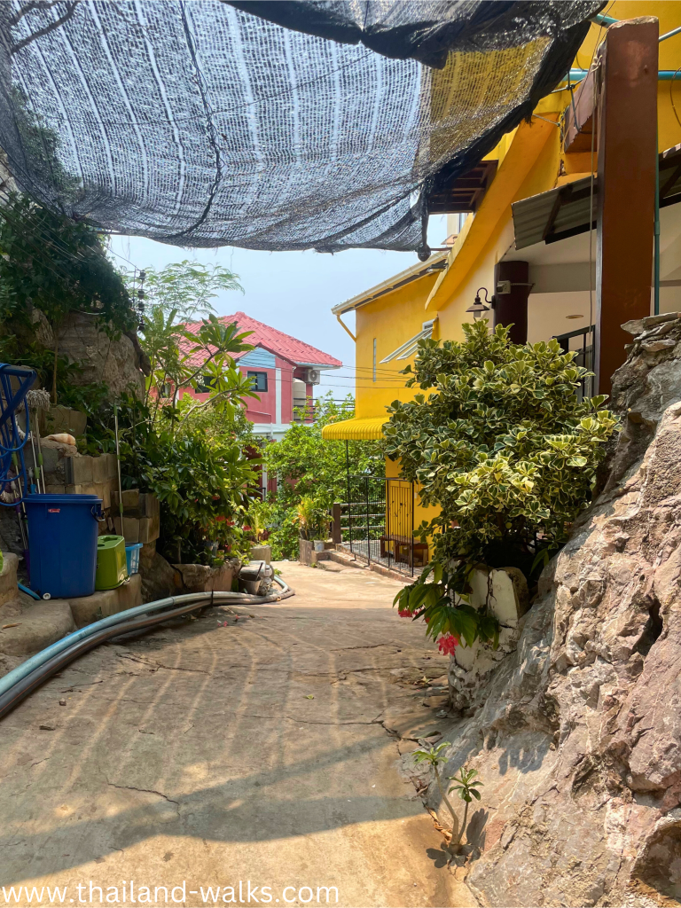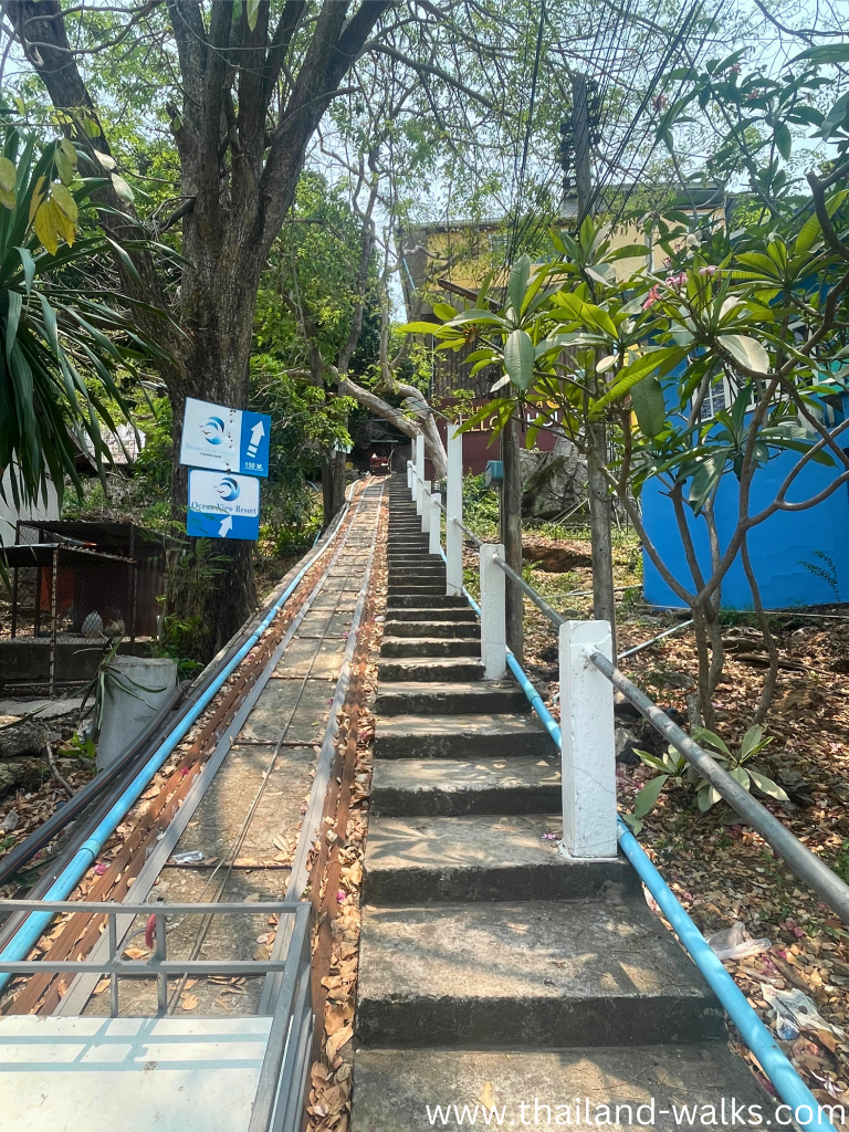 After taking a TukTuk, winding through the streets of Koh Si Chang, slowly ascending up a large hill, dodging a wild boar, I arrived at in the parking lot. The hotel is located another 100 meters up, and the guest is required to carry their luggage up the steps, towards the hotel.